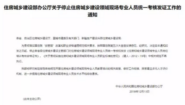 ❶《關于停止住房(fáng)城(chéng)鄉(xiāng)建設領域現(xiàn)場(chǎng)專業(yè)人(rén)員(yuán)統一(yī)考核發證工(gō ng)作(zuò)的(de)通(tōng)知(zhī)》